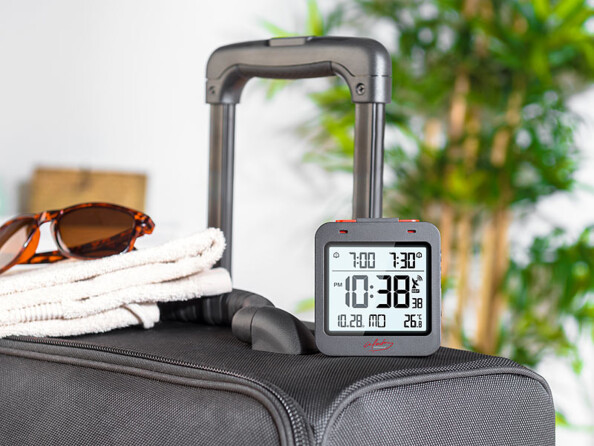 Emportez ce petit réveil radio-satellite partout avec vous. Ce modèle radio-piloté compacte peut être emmené en sortie, voyage, déplacement professionnel… Programmez jusqu'à deux alarmes de réveil : une pour aller travailler et l'autre pour le week-end ! Consultez-le très facilement dans la nuit : allumez le rétroéclairage en appuyant sur n'importe quel bouton.