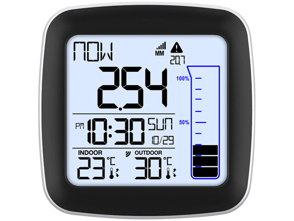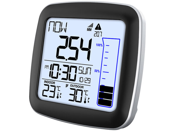 - Affiche les précipitations totales et en cours, l'historique de pluviométrie, les températures extérieures et intérieures, la date, le jour, l'heure, l'heure de réveil