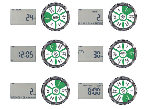 - Réglages : heure de début, durée de 1 à 180 minutes, intervalle valable jusqu'à 4 fois par jour pour un jour défini de la semaine ou pour 15 jours individuellement