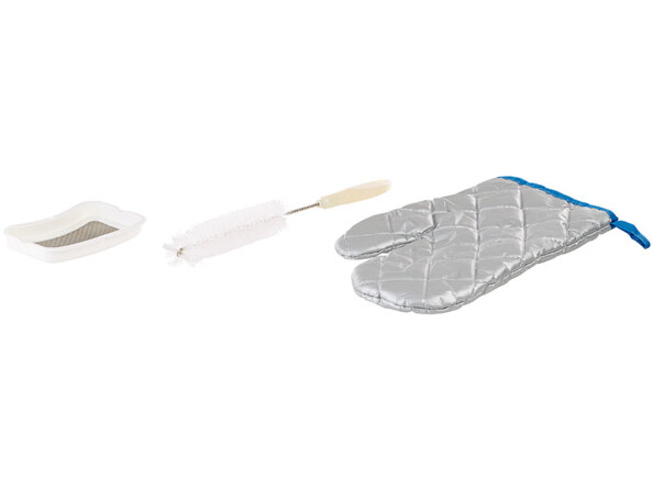 - Accessoires : entonnoir avec couvercle, collecteur d'huile, collecteur de résidus, tamis, brosse de nettoyage, gant de protection contre la chaleur