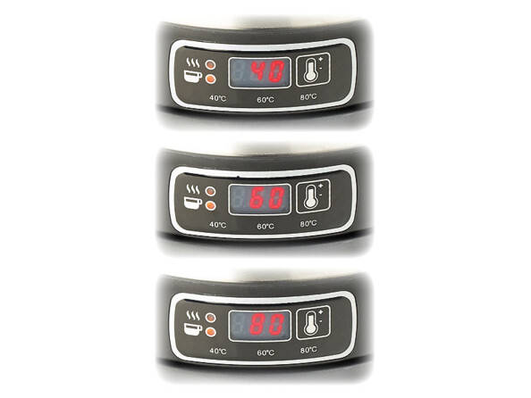 - Fonction Maintien au chaud, l'eau bout puis redescend à la température sélectionnée : 40 °C, 60 °C, 80 °C