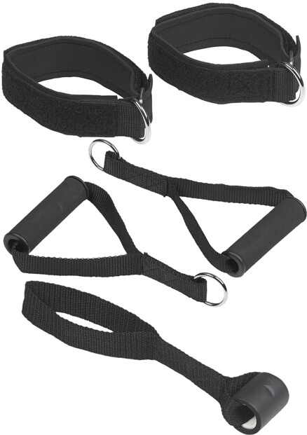 - Extenseurs comprenant 2 poignées, 2 sangles de pieds, ancre de porte, sac de rangement, mode d'emploi