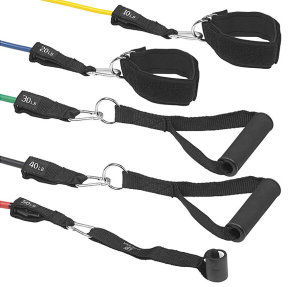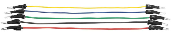 - 5 extenseurs de différentes épaisseurs : jaune (4,5 kg), bleu (9 kg), vert (13 kg), noir (18 kg), rouge (22 kg)