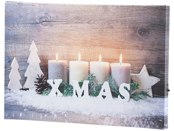 Le tableau à LED "Bougies de Noël" représente une nature morte neigeuse avec des bougies, du bois, et une inscription univoque : XMAS. L'ambiance hivernale de Noël résumée en une seule image.