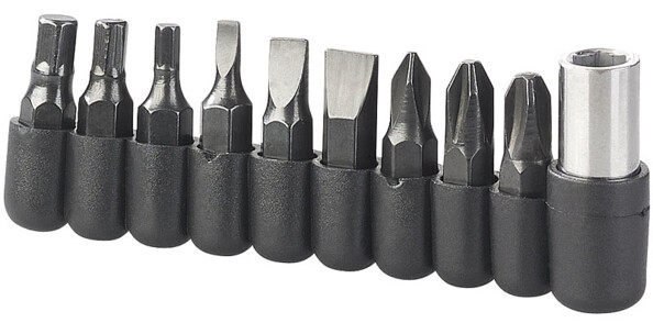 - 9 embouts avec adaptateur à 4 pans dans support de rangement : 3 à 6 pans (3 mm, 4 mm, 5 mm), 3 plats (3 mm, 5 mm, 7 mm), 3 cruciformes (5 mm, 6 mm, 6 mm)