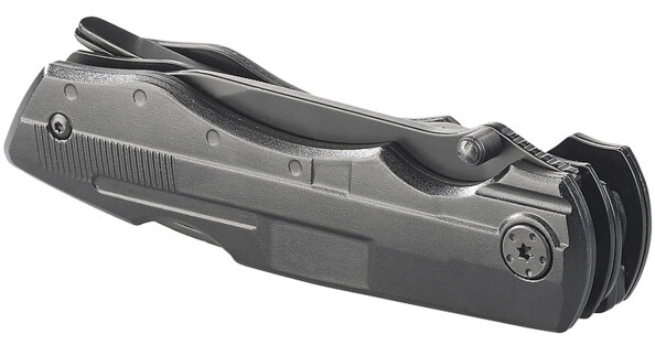 - 5 fonctions : couteau de poche avec scie, pince, ouvre-boîte, ouvre-bouteille, support à 4 pans pour embouts de tournevis