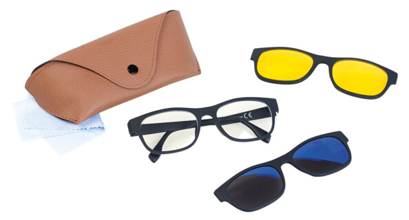 Un simple clip magnétique permet de transformer les lunettes transparentes en lunettes de soleil ou de conduite nuit en un rien de temps. Grâce aux fixations aimantées, le changement est simple et rapide. Les sur-lunettes de soleil sont équipées d'une véritable protection solaire UV400 et la teinte des verres filtre l'excès de luminosité. Le petit plus : les verres étant polarisés, les reflets sont filtrés et l'éblouissement nettement réduit.
