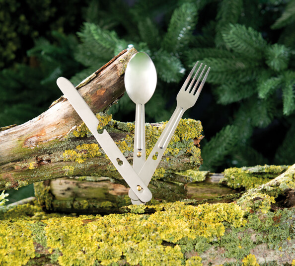 Tout ce dont vous avez besoin pour manger confortablement n'importe où. Avec un couteau, une fourchette et une cuillère, vous n'aurez plus à faire à des couverts en plastique qui se cassent facilement. Même un ouvre-bouteille est intégré dans le manche du couteau. Idéal pour le camping, les randonnées et les festivals : les couverts trouvent leur place dans n'importe quel bagage. Pour le transport, il suffit de les assembler et le tour est joué. Glissez simplement le support vers le haut pour que tout tienne ensemble.