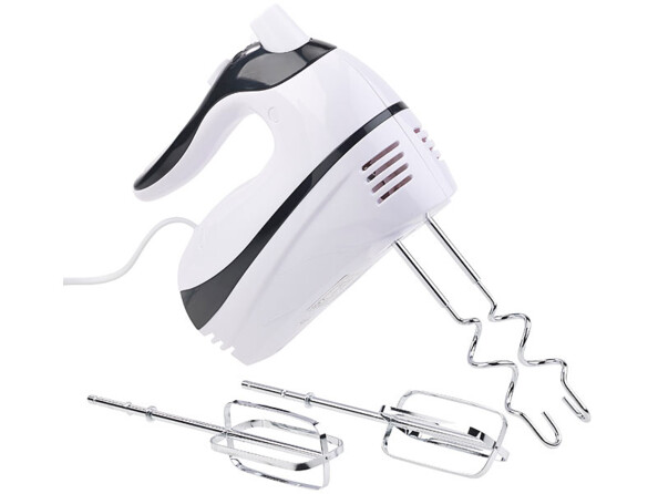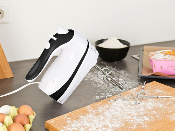 - Batteur à main livré avec 2 crochets de pétrissage et 2 fouets