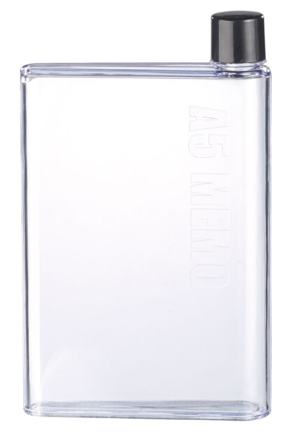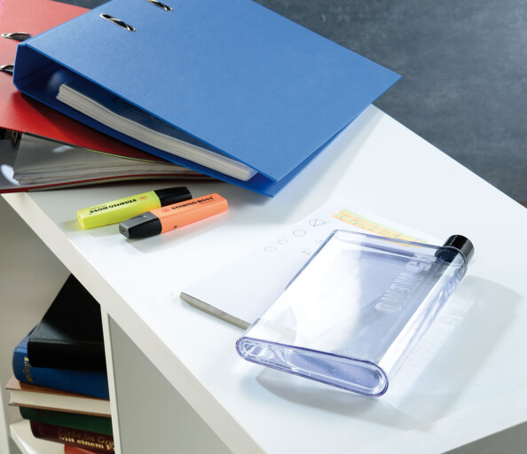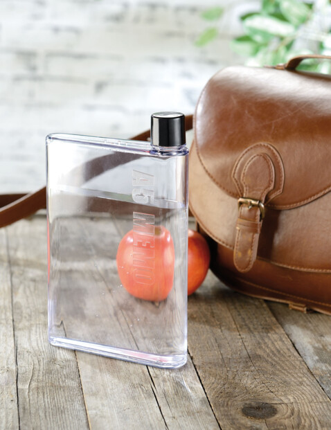 Stable et ultraplate, cette gourde rectangulaire est conçue pour se glisser facilement dans un porte-documents ou un cartable.
