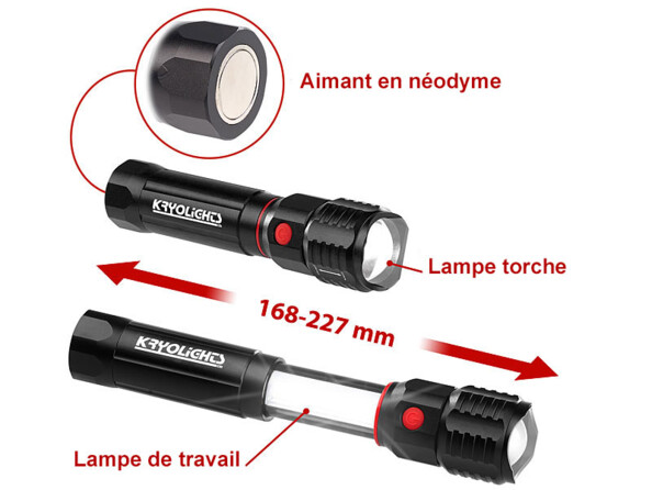 - Longueur : 17 cm en lampe torche, 24 cm en lampe de travail, Ø 42 mm