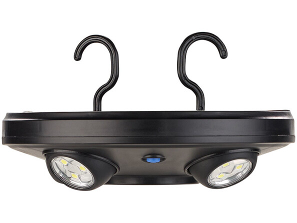 Pratiques, les 2 crochets permettent même de suspendre la lampe à une corde, à une branche ou à une barre de tente. Vous pouvez donc l'utiliser dans de très nombreuses situations, même sans parasol !