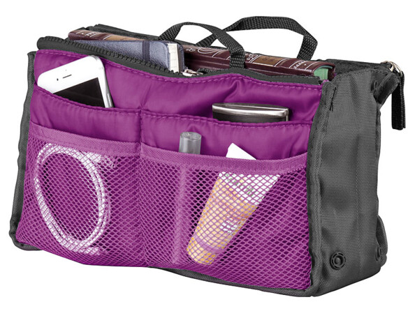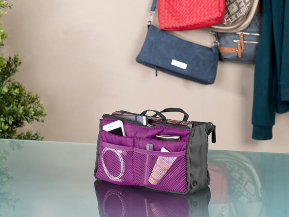 L'organisateur de sac à main à l'élégant coloris violet dispose de 13 compartiments dans lesquels tous vos accessoires trouvent leur place : téléphone portable, agenda, porte-monnaie, trousseau de clés, etc.