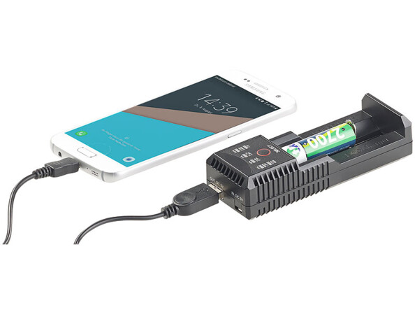 En plus de permettre le rechargement d'un accu utilisable avec de nombreux appareils (console portable, appareil photo numérique...), ce petit chargeur peut apporter de l'énergie pour vos appareils mobiles USB : insérez l'accu li-ion rechargé, et vous disposez d'une batterie de secours modulable !