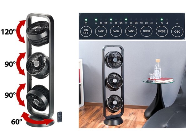 Ce ventilateur original est doté de 3 hélices disposées verticalement.