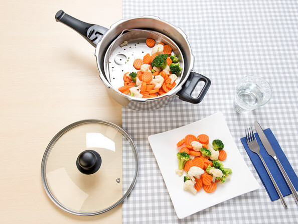 Différents dispositifs de sécurité : vous verrouillez et déverrouillez le couvercle à l'aide d'une seule commande coulissante et d'un mouvement de rotation. La surpression s'échappe du régulateur ou de la soupape de sécurité de manière contrôlée. L'anneau d'étanchéité et les cavités sur le bord de la casserole garantissent une sortie de vapeur sûre maîtrisée.