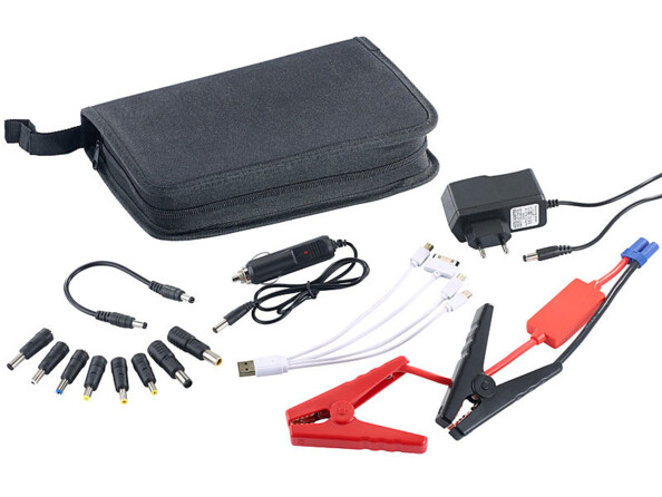 - Inclus : câble de démarrage avec pinces crocodiles plus/moins, 8 adaptateurs de chargement, câble de chargement USB universel, adaptateur secteur 230 V, housse de transport