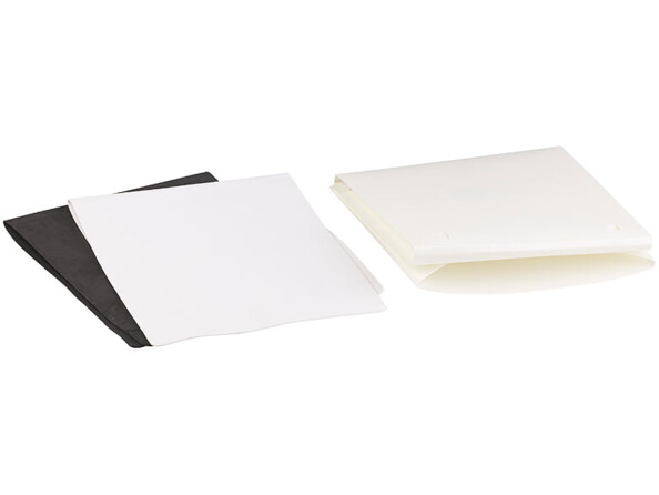 L'éclairage est fourni par 2 LED COB, placées à l'arrière et à l'avant. Les parois du cube laissent passer la lumière pour créer une lumière diffuse, sans ombre marquée ni reflets gênant. Vous obtenez ainsi un éclairage parfait, qui vous permet de réaliser des clichés de qualité professionnelle. Et pour un résultat irréprochable, utilisez les fonds flexibles fournis : choisissez entre le fond noir et le fond blanc selon l'atmosphère recherchée.