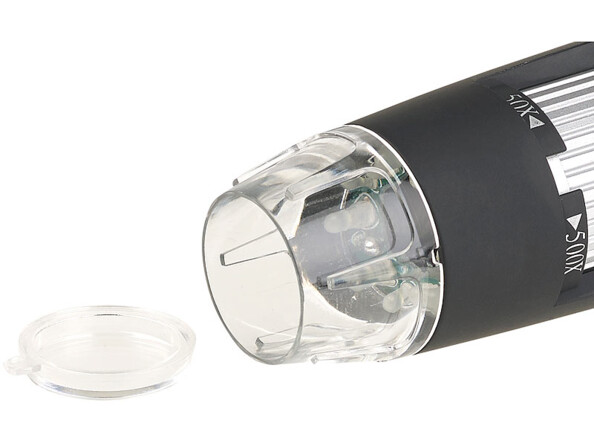 - Dimensions du microscope (Ø x L) : 33 x 112 mm, support (Ø x H) : 70 x 110 mm, poids total : 150 g
