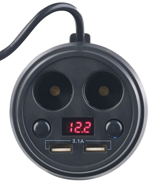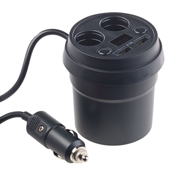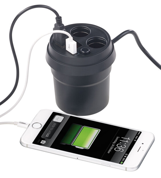 Avec un total de 80 W, les 2 prises 12/24 V vous fournissent assez d'électricité pour un chauffage de siège et votre GPS, par exemple. Vous pouvez aussi alimenter aussi un lecteur DVD portable pendant vos pauses. Les 2 prises USB vous permettent d'alimenter votre smartphone ou vos tablettes énergivores ! Il se glisse dans n'importe quel porte-gobelet grâce à sa forme de tasse à café.