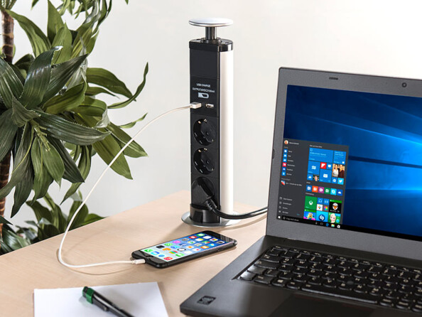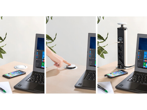 Tant que vous n'avez pas besoin d'électricité, cette multiprise est aussi plate qu'une crêpe. Besoin de recharger un appareil ou de brancher un périphérique supplémentaire ? Hop, la multiprise sort de sous la table et ne reste présente que tant que vous avez besoin d'un accès à une prise, avant de libérer à nouveau de la place.