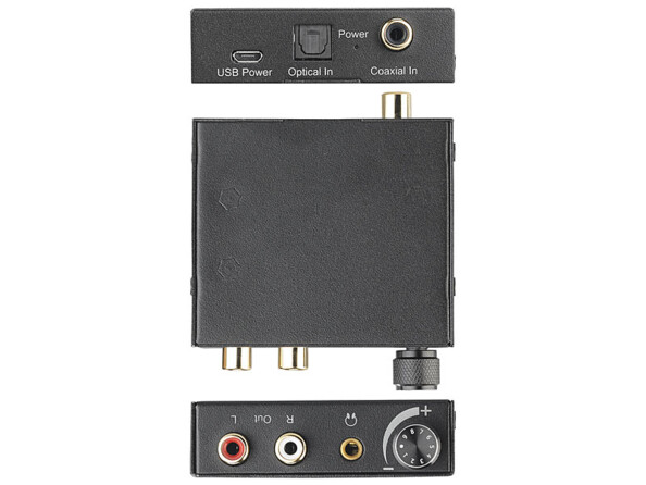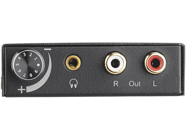 - Connectique : entrée TOSLINK (optique), entrée coaxiale (électrique), sortie cinch stéréo (analogique RCA) et casque (prise casque jack 3,5 mm)
