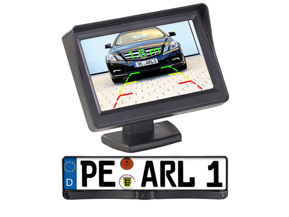 - Support pour plaque d'immatriculation avec caméra et capteurs, inclus : avertisseur sonore de distance, câble de raccordement, câble vidéo et matériel de montage
