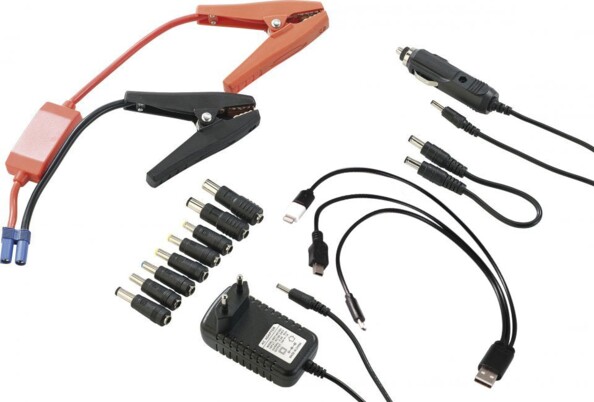 - Livré avec la batterie : câble de démarrage voiture, câble de chargement pour prise allume-cigare, 8 adaptateurs différents, câble de chargement universel, adaptateur secteur, valise e transport