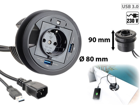 Hub USB encastrable avec prise 230 V, 2 ports USB 3.0 et passe-câbles