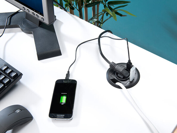 Rapidement installé et prêt à être utilisé, le hub s'encastre simplement dans un trou de 80 mm percé dans votre bureau. Le passe-câbles permet d'arranger la configuration de votre espace de travail en faisant ressortir votre connectique directement sur le bureau.