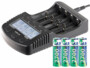- Chargeur de piles rechargeables avec bloc d’alimentation, 4 accus, boîte de rangement