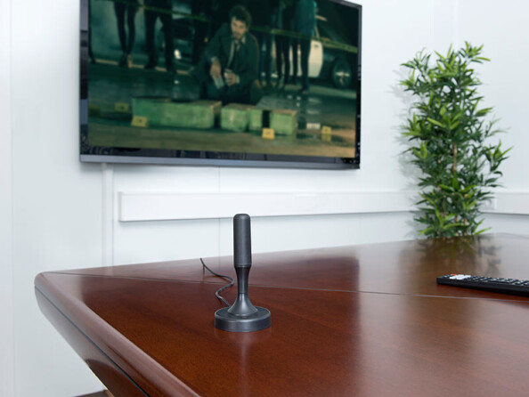 Compacte et discrète : avec une hauteur de 13 cm et un pied de support de seulement 7 cm de diamètre, cette antenne d'intérieur sait se faire oublier.