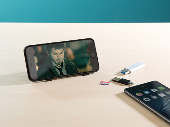 Astucieux : le porte-carte sert également de lecteur de carte MicroSD. Insérez simplement une carte MicroSD dans le lecteur, et branchez celui-ci dans un port USB ou sur le port Micro-USB de votre smartphone.