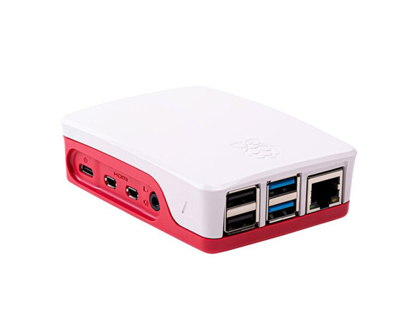 Le kit comprend un boîtier rouge et blanc pour protéger le Raspberry Pi 4, une carte micro SD de 32 Go pour enregistrer le système d'exploitation, une alimentation USB-C compatible, un câble micro HDMI vers HDMI ainsi qu'un set de 3 dissipateurs de chaleur.