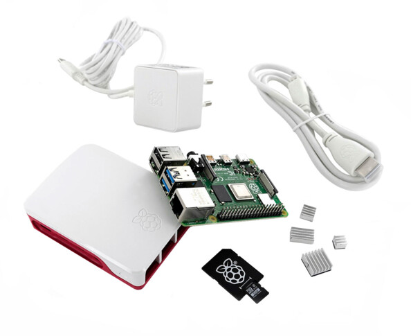 - Le kit contient le Raspberry Pi 4 8 Go avec boîtier, 1 carte micro SD (32 Go), 1 alimentation pour Pi 4, câble Micro-HDMI vers HDMI et 3 dissipateurs de chaleur