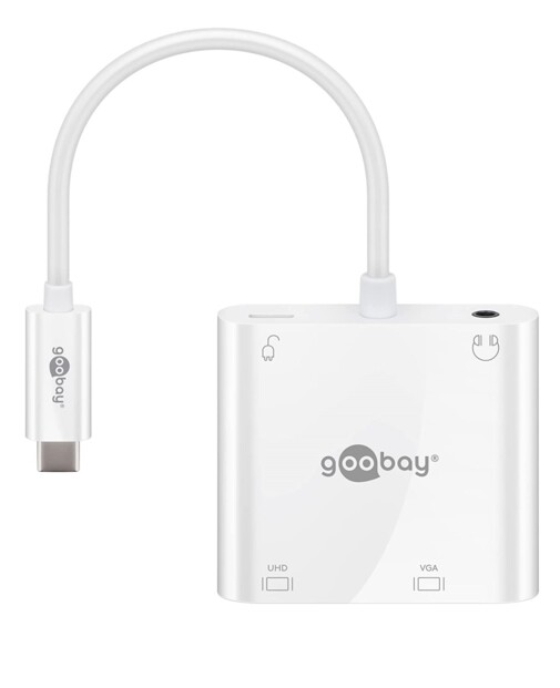 - Adaptateur avec câble USB-C vers HDMI, VGA, USB-C et audio Jack, par Goobay