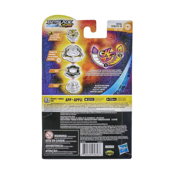La toupie Beyblade Genesis 5 est vendue avec une pastille GT, interchangeable avec d'autres toupies compatibles avec les pastilles GT