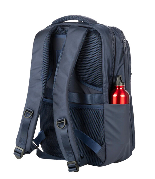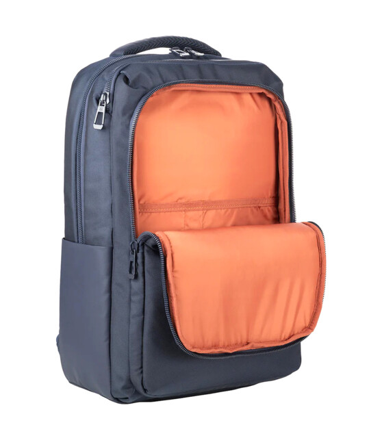 Le sac à dos est doté d'un grand nombre de rangements et d'équipements. Il est équipé d'un grand compartiment spacieux avec deux poches rembourrées pour un ordinateur portable et une tablette, de trois autres compartiments avec des espaces de rangement de tailles différentes, de deux poches latérales et de deux poches dissimulées, une sur le dos pour vos effets sensibles et une sur le dessous équipée d'une housse de protection contre la pluie.