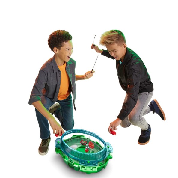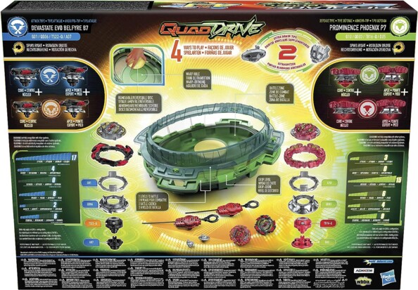 - Contenu : 1 Arène de combat Beyblade Burst QuadDrive avec disque amovible, 2 Toupies Beyblade Burst QuadDrive avec 2 pointes de boucliers supplémentaires, 2 Lanceurs et un Guide de démarrage rapide