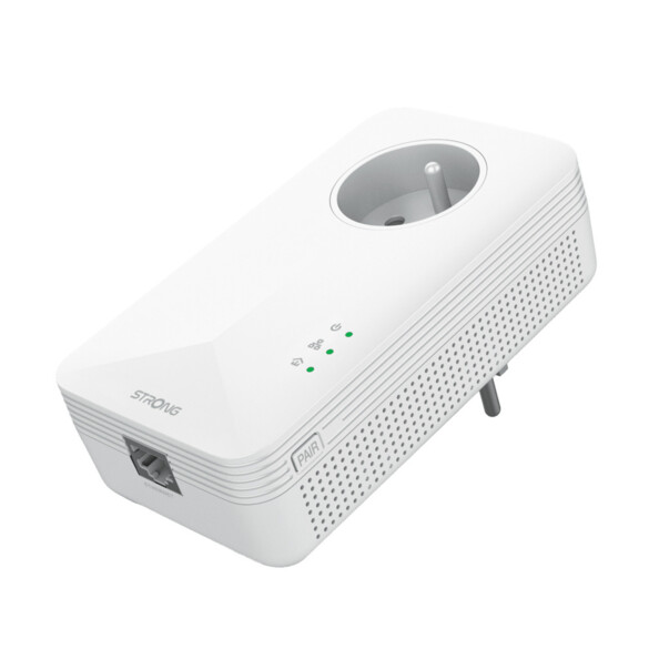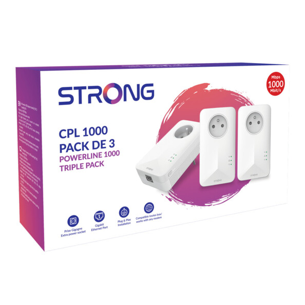 Ces trois boîtiers courants porteurs en ligne avec prise gigogne filtrée Powerline 1000 Triple Pack de la marque Strong utilisent les câbles électriques de votre domicile pour transmettre un signal Internet très haut débit à partir d’un routeur ou d’un modem quelconque. Les périphériques branchés à leur port LAN Gigabit Ethernet RJ45 bénéficient ainsi d’une connexion Internet filaire sécurisée avec une vitesse de transfert des données ultra-rapide jusqu’à 1000 Mb/s.