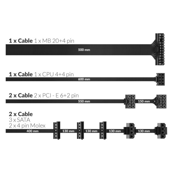 - Connectique : 1 x 20+4 broches pour carte mère, 1 x ATX/EPS 12 V, 2 x PCI-E 6+2 broches, 6 x SATA et 4 x Molex 4 broches