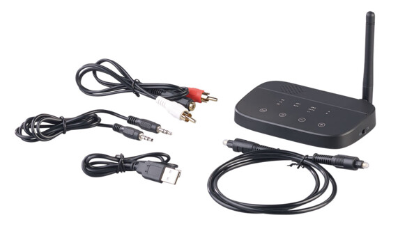 - Transmetteur récepteur, 1 câble d'alimentation Micro-USB, 3 câbles audio (1 câble optique, 1 câble AUX avec connecteur jack mâle 3,5 mm, et 1 câble jack femelle 3,5 mm vers cinch stéréo)