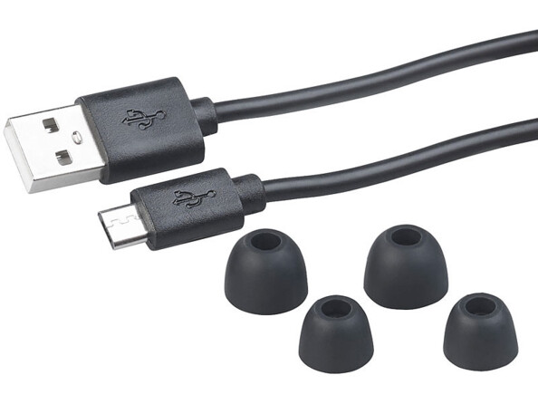 - Oreillettes intra-auriculaire True Wireless IHS-670, embouts en silicone (2 tailles), étui de chargement, câble de chargement USB (Micro-USB vers USB), mode d'emploi en français