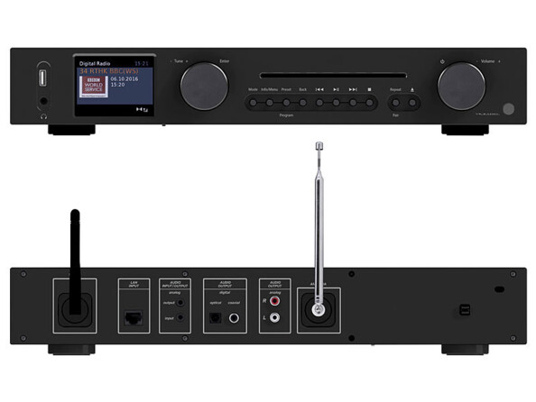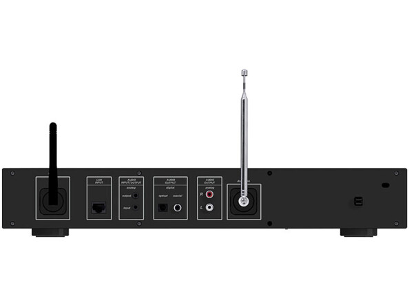 - Connectique à l'arrière : sortie Cinch stéréo, entrée et sortie Line (prise jack 3,5 mm), TOSLINK (sortie optique), coaxiale (sortie numérique), RJ-45 (LAN, à des fins de service), à l'avant : port USB et prise casque (jack 3,5 mm)