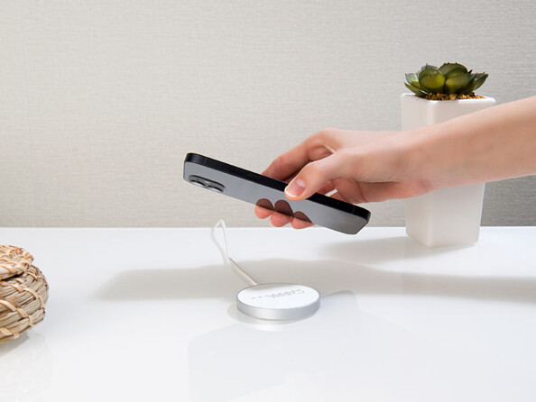 Le petit plus qui change tout : la station se fixe par aimantation sur la face arrière de votre smartphone. Ainsi, vous pouvez continuer à utiliser le smartphone pendant le chargement !