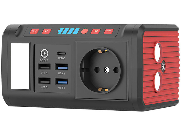 - Batterie lithium-ion intégrée 24000 mAh (88,8 Wh), chargement par prise 230 V, adaptateur 12 V ou panneau solaire (adaptateur allume-cigare non fourni)