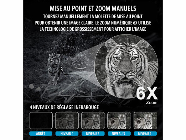 Réglez la lumière infrarouge sur quatre niveaux pour voir le soir, au crépuscule ou encore dans la nuit noire : l'appareil vous confère une visibilité nocturne jusqu'à 500 mètres ! Et pour voir encore plus loin, activez simplement le zoom numérique 6x.