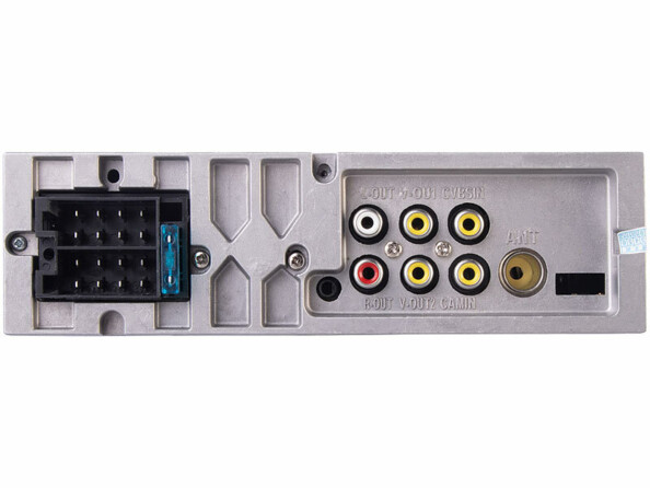 - Connectique pour montage : 2 prises ISO (sortie audio, alimentation, commandes au volant, caméra de recul), entrée stéréo jack, 2 sorties audio Cinch (droite/gauche), 2 entrées et sorties vidéo Cinch, prise pour raccordement de l'antenne