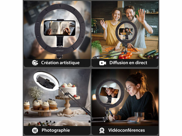 Grâce à l'anneau LED 10" avec pied à ressort et support smartphone, filmez votre contenu avec un éclairage optimal ; l'anneau lumineux réglable crée une lumière uniforme sans ombre, idéale pour les pros et les amateurs. Que vous soyez sur YouTube, Twitch, TikTok, vos vidéos n'en seront que plus belles !