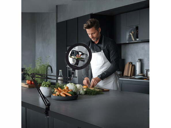 Que ce soit sur une table, en studio ou en déplacement, le trépied compact est facile à installer et se range de manière compacte. Le bras réglable en hauteur permet de positionner l'anneau lumineux précisément devant le sujet ; c'est particulièrement pratique si vous souhaitez filmer un objet précis, par exemple pour réaliser des tutoriels ou des présentations de produits.